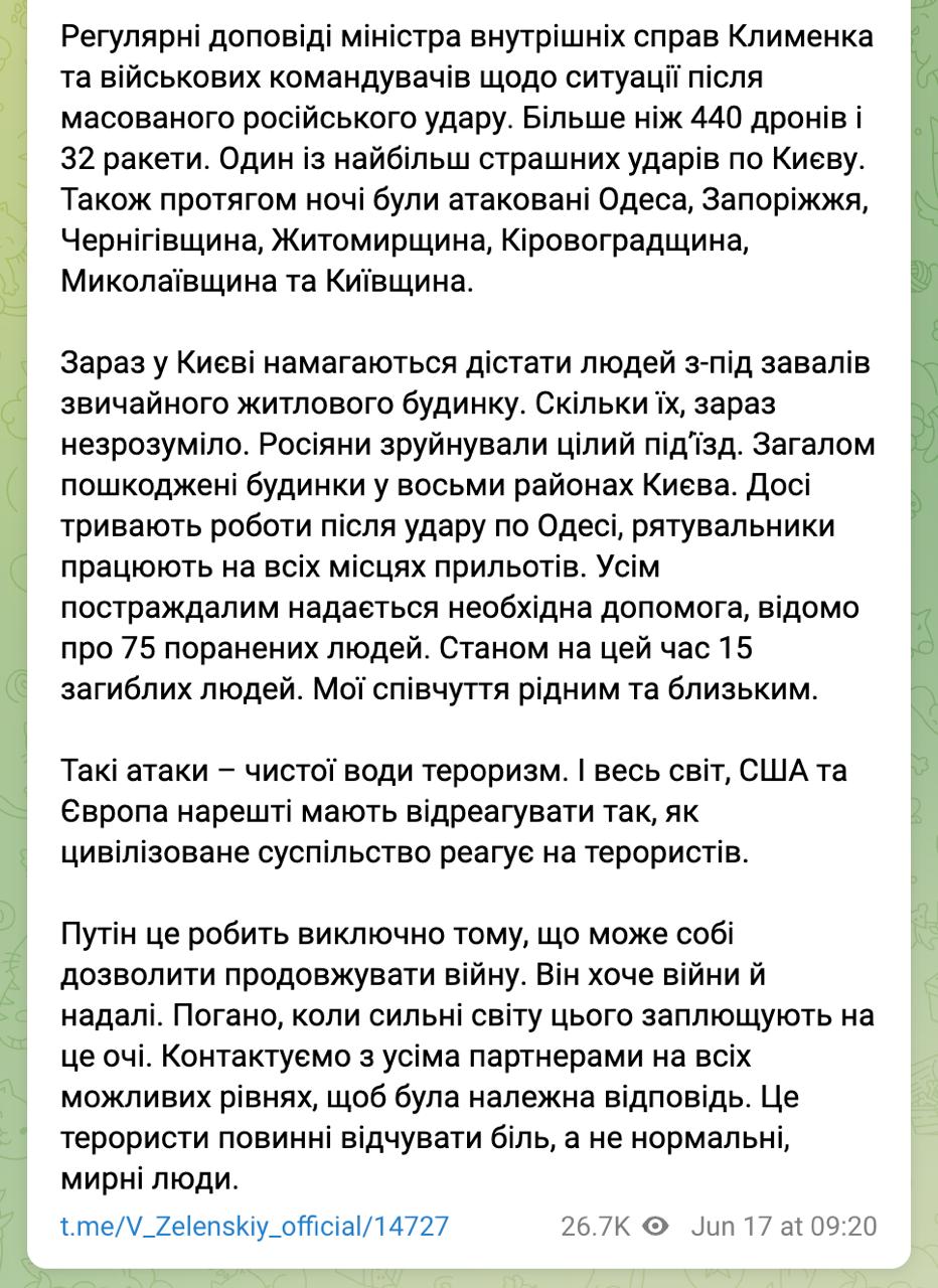 9.28 Украину этой ночью атаковали более 440 дронов и 32 ракеты, сообщил Зеленский.