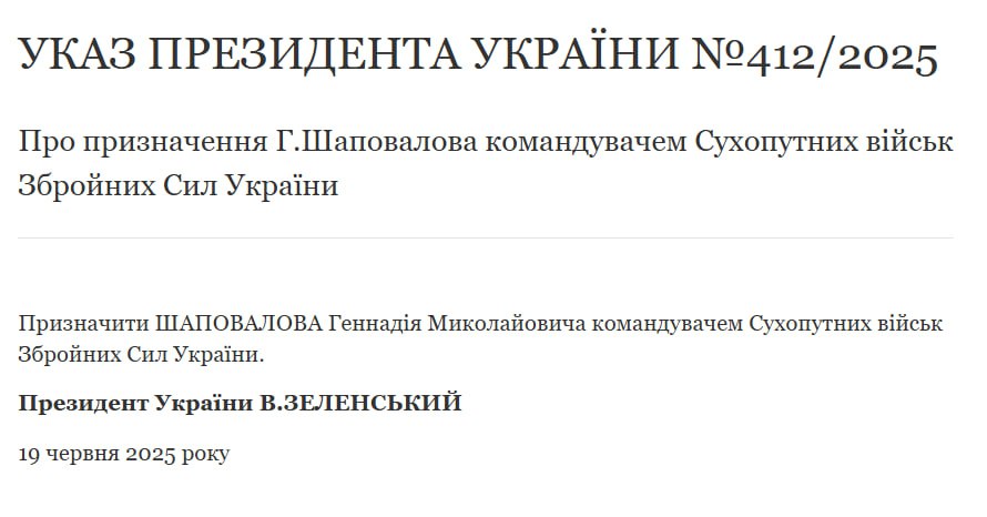 "Назначить Шаповалова Геннадия Николаевича командующим Сухопутными войсками Вооруженных сил Украины", — сказано в тексте документа.