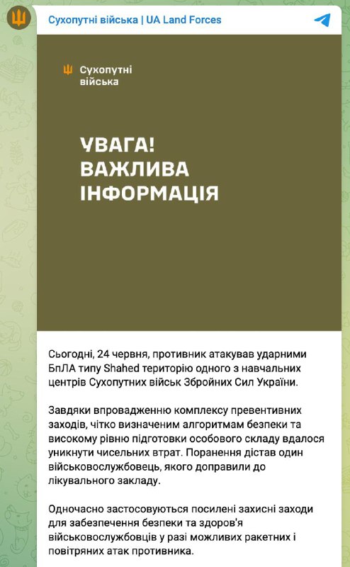 13:02 Сухопутные войска сообщают, что сегодня "Шахеды" ударили по учебному центру ВСУ.