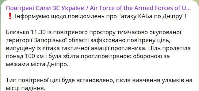 По Днепру был осуществлен удар "воздушной целью, выпущенной с самолета тактической авиации", которая пролетела более 100 км. Однако не подтверждается, что это был КАБ.