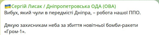 В то же время глава Днепропетровской ОВА Сергей Лысак заявил, что в Днепре была сбита новейшая бомба-ракета "Гром-1".