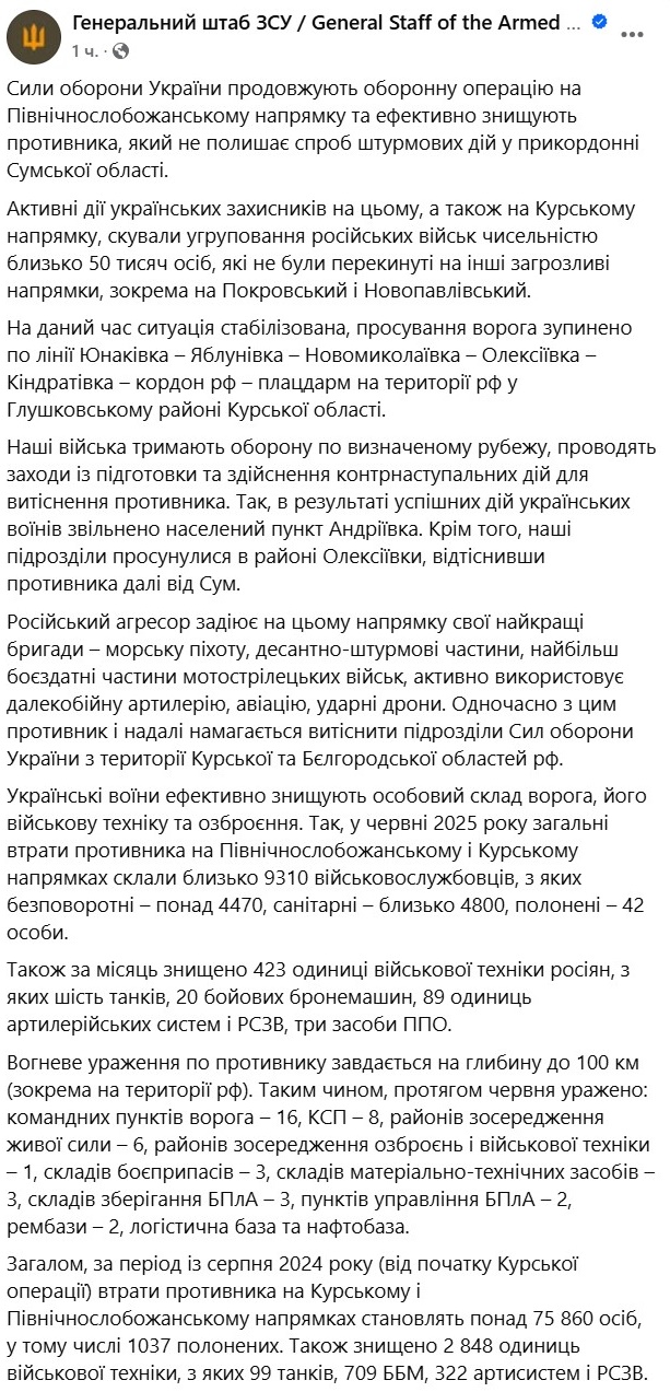"В результате успешных действий украинских воинов освобожден населенный пункт Андреевка. Кроме того, наши подразделения продвинулись в районе Алексеевки, оттеснив противника подальше от Сум", - пишет Генштаб.
