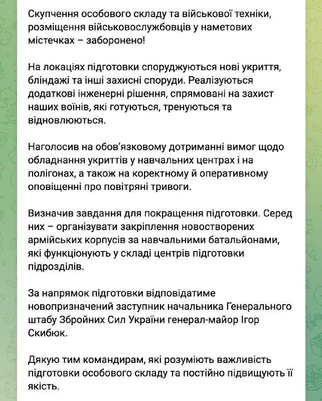 Также Сырский отметил, что во время обучения запрещено скопление личного состава и военной техники, как и размещение военнослужащих в палаточных городках. Он заверил, что на местах подготовки строят новые укрытия и блиндажи.