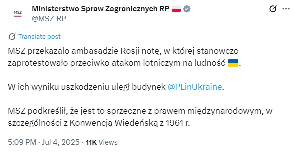 "МИД направил в посольство России ноту, в которой выразил решительный протест против авиаударов по населению Украины. В результате пострадало здание посольства Польши в Украине. Это противоречит международному праву, в частности Венской конвенции 1961 года", - сказано в публикации.