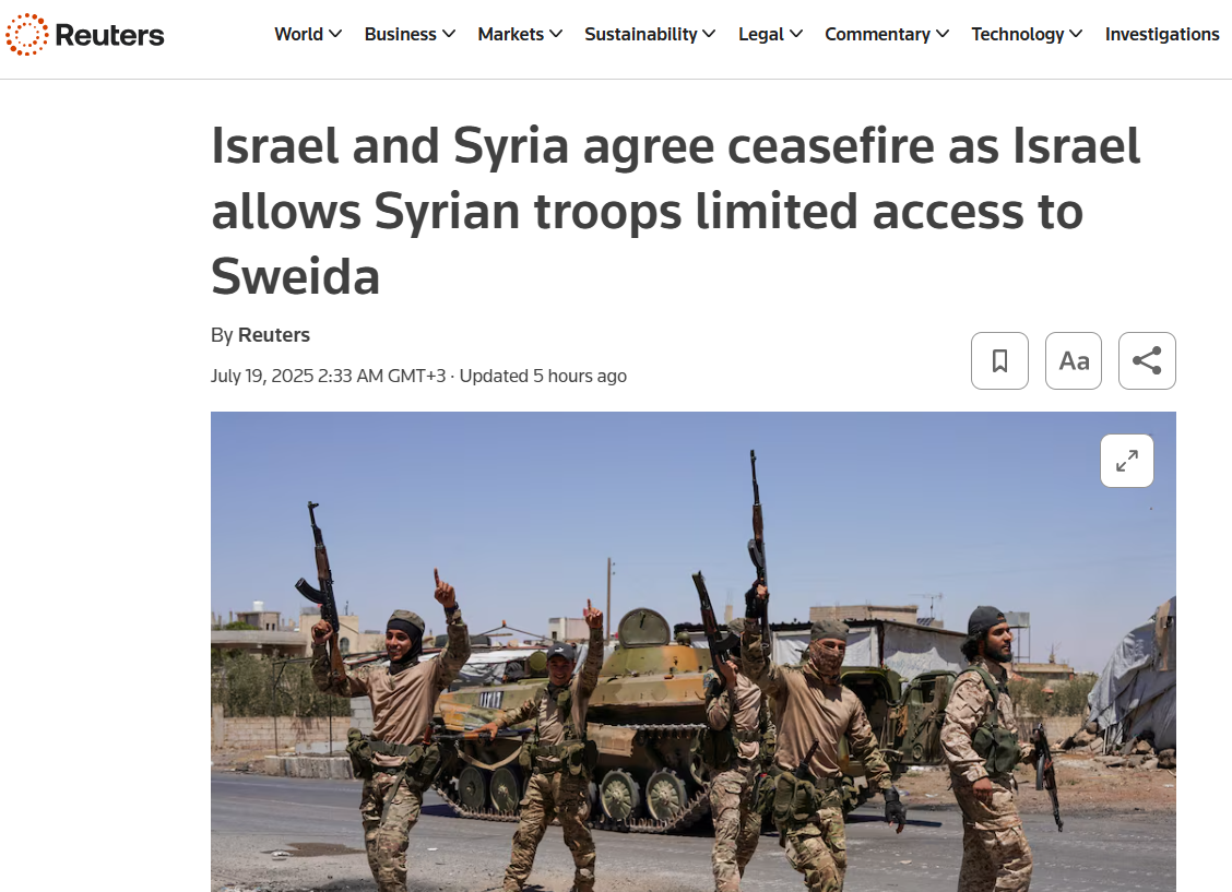 В то же время СМИ пишут, что столкновения в Сувейде между поддерживаемыми Израилем друзами и близкими к новому правительству Сирии силами продолжаются.