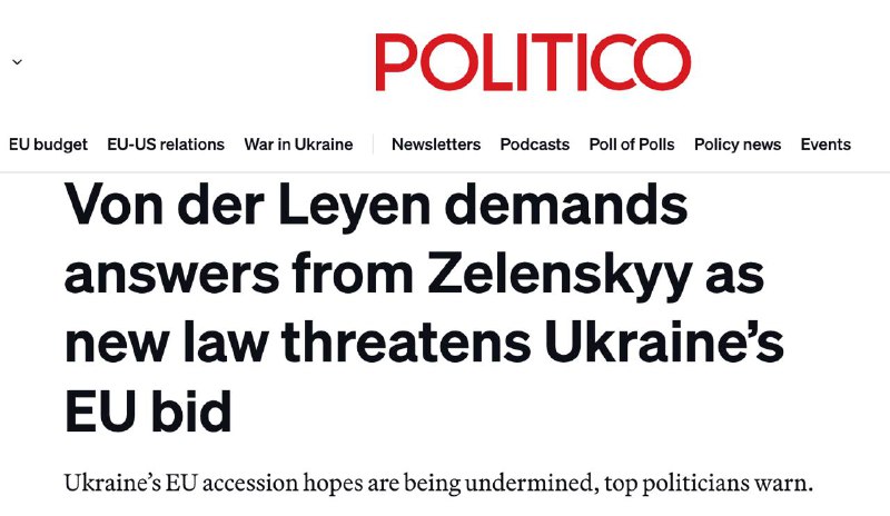 Между тем в ЕС продолжают критиковать действия украинских властей по отношению к антикоррупционным ведомствам. Президент Еврокомиссии Урсула фон дер Ляйен выразила серьезную обеспокоенность ситуацией с НАБУ. Представитель ЕК Гийом Мерсье заявил, что "компромисс в этом вопросе невозможен", сообщает Politico.