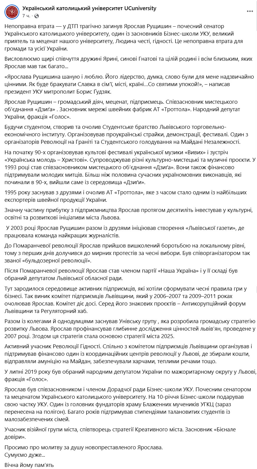 На западе Украины погиб народный депутат от "Голоса" Ярослав Рущишин. Об этом сообщает Украинский католический университет.