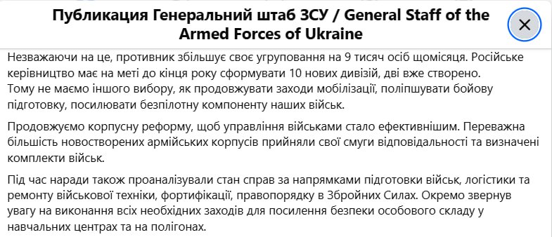 "Противник увеличивает свою группировку на 9 тысяч человек ежемесячно. Российское руководство преследует цель до конца года сформировать 10 новых дивизий, две уже созданы. Поэтому нет другого выбора, как продолжать меры мобилизации, улучшать боевую подготовку, усиливать беспилотную компоненту наших войск", – сообщил Сырский.