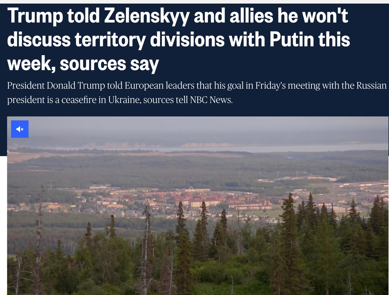 По данным NBC News, Трамп сообщил европейцам, что он не намерен обсуждать разделы территории с Путиным на Аляске. Источники говорят, что президент США будет настаивать на прекращении огня.