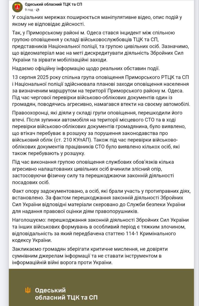 Тем временем Одесский областной ТЦК в своем комментарии обвинил в инциденте гражданских, которые оказывали "злостное сопротивление".