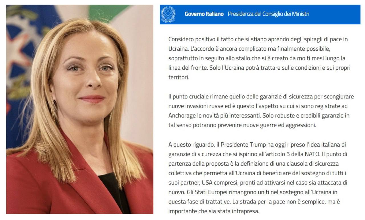 "Ключевым вопросом остаются гарантии безопасности для предотвращения новых российских вторжений, и именно в этом аспекте в Анкоридже были зафиксированы самые интересные новости. Президент Трамп сегодня вернулся к итальянской идее гарантий безопасности, вдохновляемых статьей 5 НАТО. Отправной точкой этого предложения является определение положения о коллективной безопасности, которое позволило бы Украине пользоваться поддержкой всех своих партнеров, включая США, готовых действовать в случае нового нападения", – заявила Мелони.