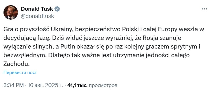 "Игра за будущее Украины, безопасность Польши и всей Европы вступила в решающую фазу. Сегодня ещё очевиднее, что Россия уважает только сильных, а Путин в очередной раз доказал, что он хитрый и беспощадный игрок. Поэтому сохранение единства всего Запада имеет решающее значение", – написал польский премьер в Х.