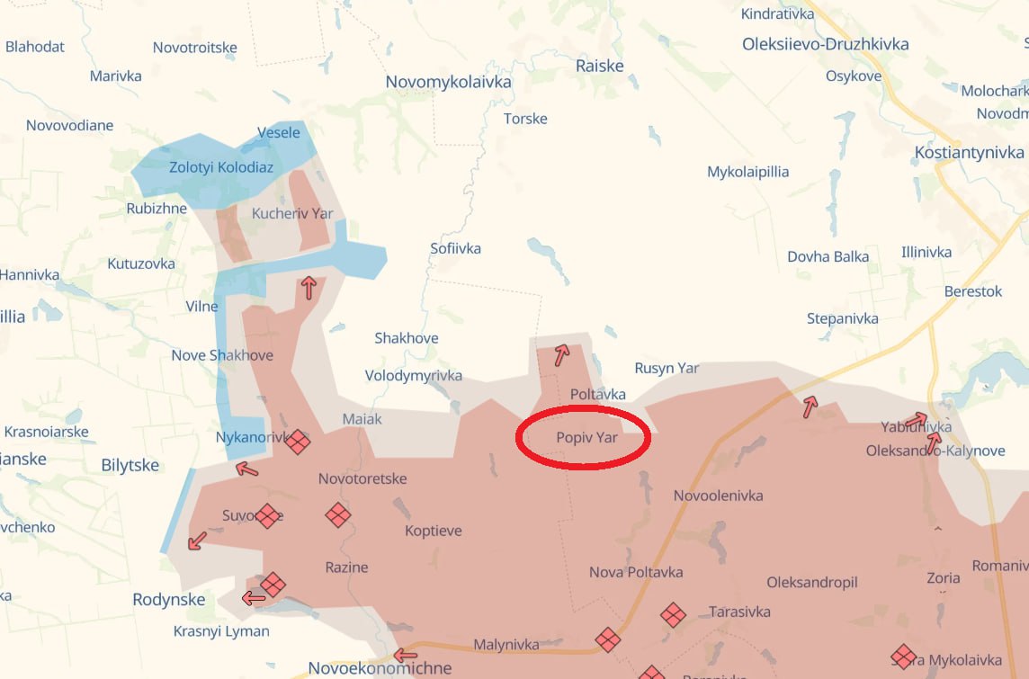15:43 Российские войска вытеснили украинские подразделения и захватили Попов Яр на Добропольском направлении и Ивано-Дарьевку на Северском направлении.