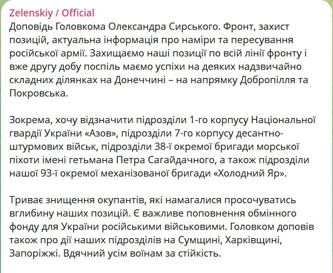 Также Зеленский сообщил, что ВСУ вторые сутки подряд имеют успехи на направлениях Доброполья и Покровска.