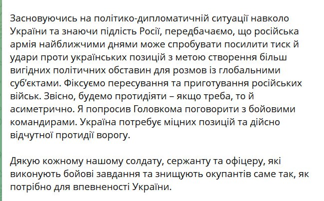 15:35 Российская армия в ближайшие дни может попытаться активизировать наступательные действия "с целью создания более выгодных политических обстоятельств для разговоров с глобальными субъектами", заявил Зеленский по итогам встречи с главкомом Сырским.