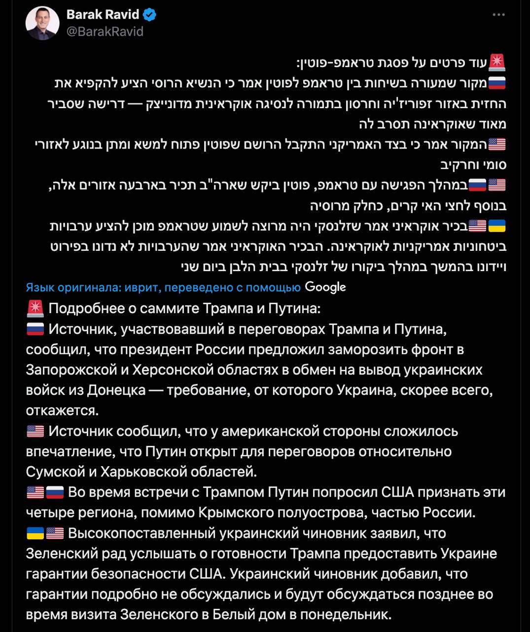 Об этом пишет журналист американского новостного вёб-сайта Axios Барак Равид.