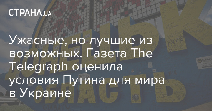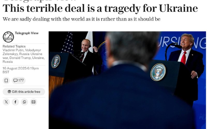 Британская газета The Telegraph в редакционной статье назвала предложение президентов Владимира Путина и Дональда Трампа о территориях ужасным, но при этом признала его, возможно, наилучшим вариантом из доступных Киеву.