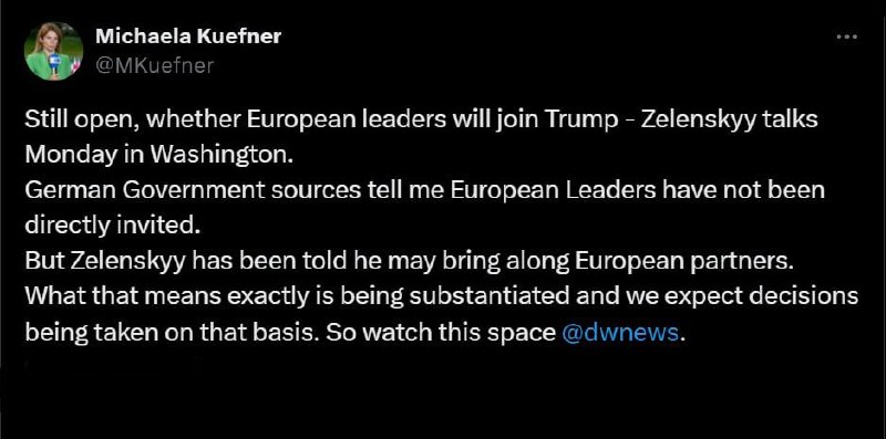 А главный редактор отдела политики Deutsche Welle Михаэла Кюфнер сообщила в Х, что европейских лидеров напрямую не приглашали на переговоры Трампа и Зеленского в понедельник.