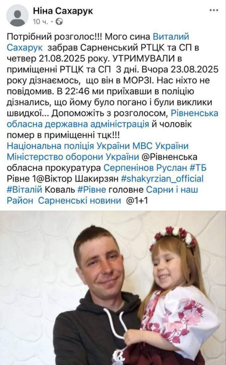 В Ровенской области скончался мужчина по имени Виталий Сахарук, которого удерживали в Сарненском РТЦК и СП.