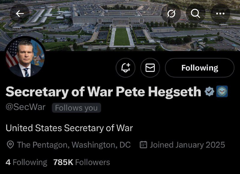 00.24 Глава Пентагона Пит Хегсет изменил описание своей страницы в Х на "Министр войны Пит Хегсет".