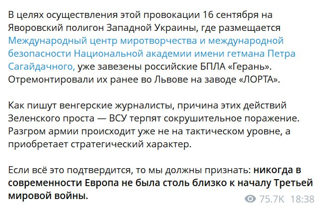 Спикер МИД РФ утверждает, что "в целях осуществления этой провокации 16 сентября на Яворовский полигон на западе Украины, где размещается Международный центр миротворчества и международной безопасности Национальной академии имени гетмана Петра Сагайдачного, уже завезены российские БпЛА "Герань". Отремонтировали их ранее во Львове на заводе "ЛОРТА".