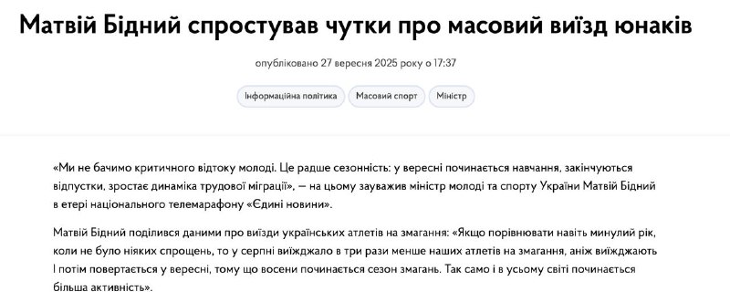 Между тем министр молодежи и спорта Матвей Бедный отрицает массовый выезд молодежи из Украины.