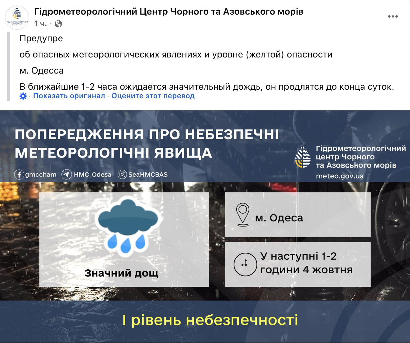 В Одессе ожидается повышенная опасности из-за дождя. В ближайшие 1-2 часа регион может настигнуть значительный дождь, который продлится до конца дня.