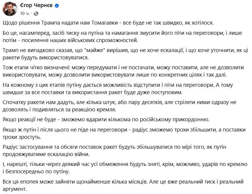 "Скорее всего, поставки и использование ракет будут очень постепенными. На каждом из этих этапов Путину дадут возможность отступить и пойти на переговоры. Сначала ракеты нам дадут, но всего несколько штук или пару десятков. Но стрелять ими сразу не позволят — будут смотреть на реакцию Кремля. Если реакции не будет — сможем ударить несколькими по российскому приграничью. Если же Путин и после этого не пойдёт на переговоры — радиус можно будет немного увеличить, а поставки немного вырастут. Радиус применения и объёмы поставок ракет будут увеличиваться по мере того, как Путин будет продолжать эскалацию войны. И, наконец, только через какое-то время все ограничения будут сняты, кроме, возможно, ударов по Кремлю и непосредственно по Путину. Вся эта эпопея может занять как минимум несколько месяцев", - написал Чернев в Фейсбуке.