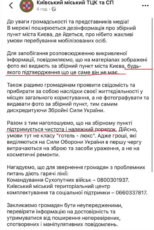 "В материалах изображены фото, которые выдают за сборный пункт города Киева, любого подтверждения, что это именно он, нет. Также советуем гражданам проявить сознание и убирать за собой последствия своей жизнедеятельности в местах общего пользования, а не фотографировать и выдавать фото за сборный пункт, тем самым дискредитируя ВСУ", - заявила пресс-служба ТЦК в Фейсбуке.