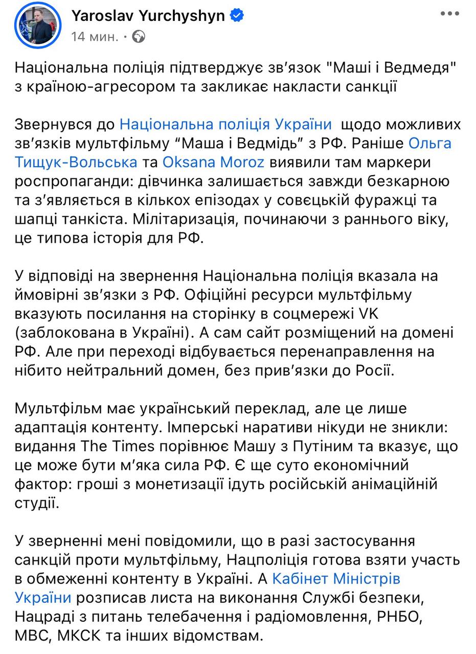 При этом Юрчишин также добавил, что в случае введения санкций Нацполиция готова приобщиться к ограничению мультфильма в Украине.