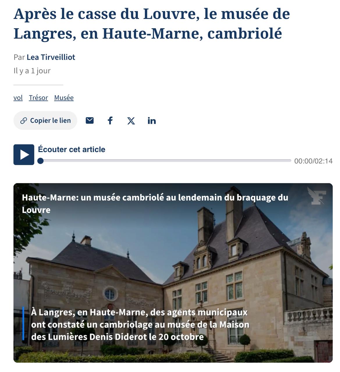 На следующий день после громкой кражи в Лувре неизвестные ограбили ещё один французский музей - Дом просвещения Дени Дидро, посвященный наследию великого французского философа и расположенный в городе Лангр (департамент Верхняя Марна).