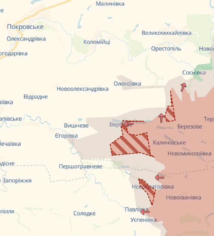 11.39 Армия РФ продвинулась в Днепропетровской области около Вербового и Степового, а также южнее, около Новогригоровки Запорожской области. Об этом сообщает Deep State.