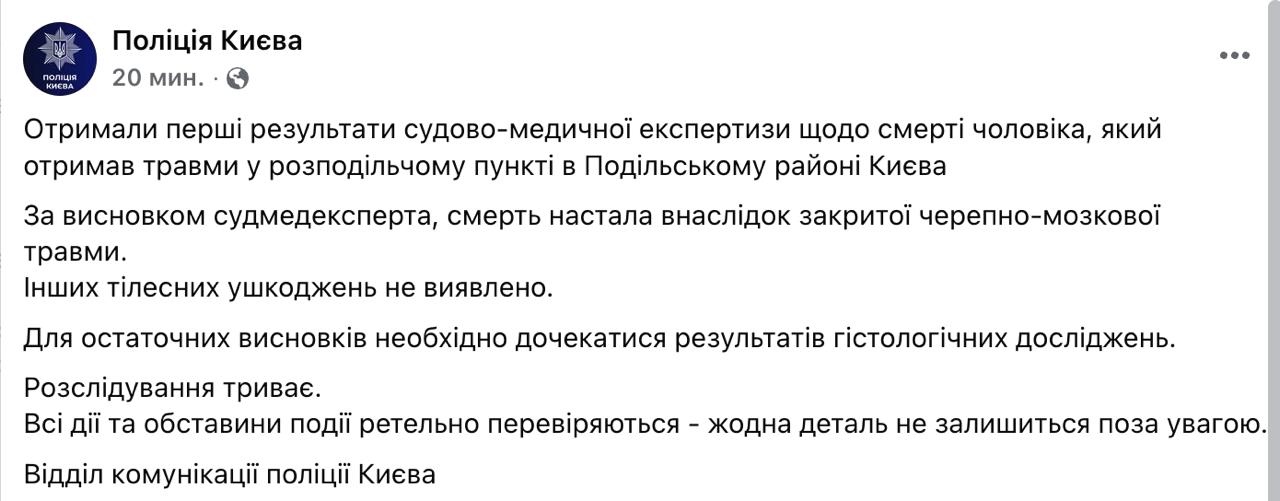 15:05 Полиция Киева подтвердила, что погибший в Подольском ТЦК мужчина умер от черепно-мозговой травмы. Как она появилась, экспертиза не уточняет.