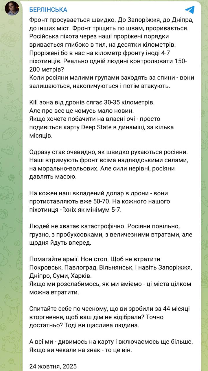 "Фронт продвигается быстро, трещит по швам, прорывается. Российская пехота через наши прореженные порядки врывается глубоко в тыл, на десятки километров. Потому что у нас на километр фронта иногда 4-7 пехотинцев. Реально ли одному человеку контролировать 150-200 метров? Когда россияне малыми группами заходят за спины – они остаются, накапливаются и затем атакуют. Kill-зона от дронов достигает 30-35 км. На каждый наш вложенный доллар в дроны они противопоставляют уже 50-70. На каждого нашего пехотинца – их как минимум 5-7. Людей не хватает катастрофически. Россияне медленно, грузно, с пробуксовками, с огромными потерями, но каждый день идут вперед", - написала Берлинская.