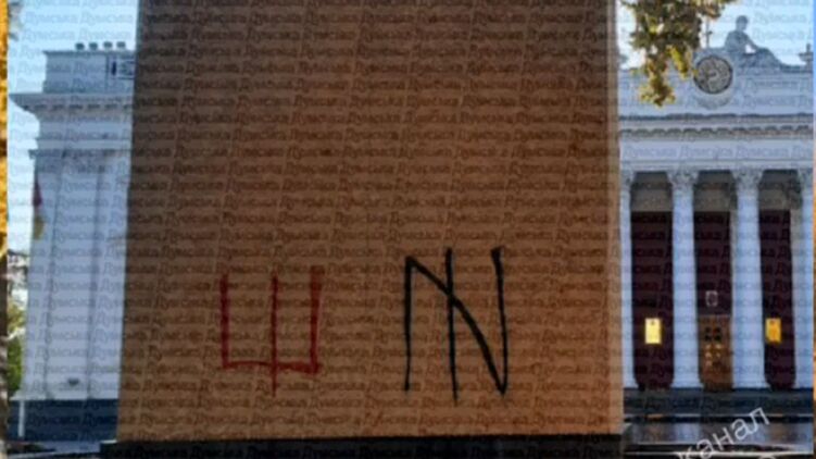 Памятник Пушкину в Одессе заколотили досками. На них тут же нарисовали символику "Азова"