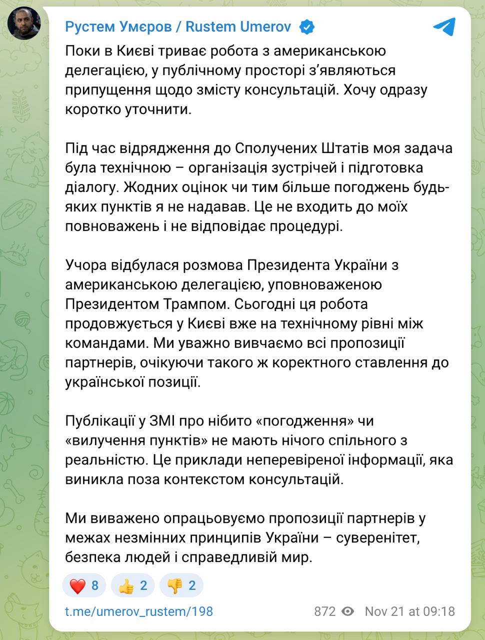 "Во время командировки в США моя задача была технической: организация встреч и подготовка диалога. Никаких оценок или тем более согласований каких-либо пунктов я не давал. Это не входит в мои полномочия и не соответствует процедуре. Вчера состоялся разговор президента Украины с американской делегацией, уполномоченной президентом Трампом. Сегодня эта работа продолжается в Киеве уже на техническом уровне между командами. Мы внимательно изучаем все предложения партнеров, ожидая столь же корректного отношения к украинской позиции", - сказано в публикации Умерова.