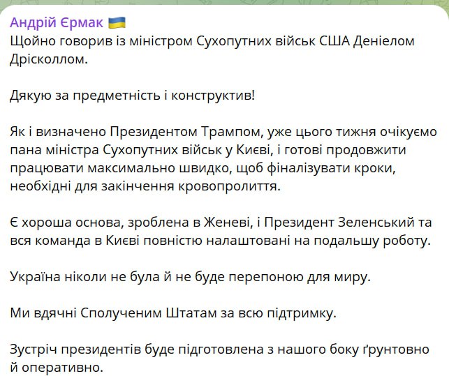 "Как и определено президентом Трампом, уже на этой неделе ожидаем господина министра Сухопутных войск в Киеве и готовы продолжить работу максимально быстро, чтобы финализировать шаги, необходимые для окончания кровопролития", - написал Ермак.