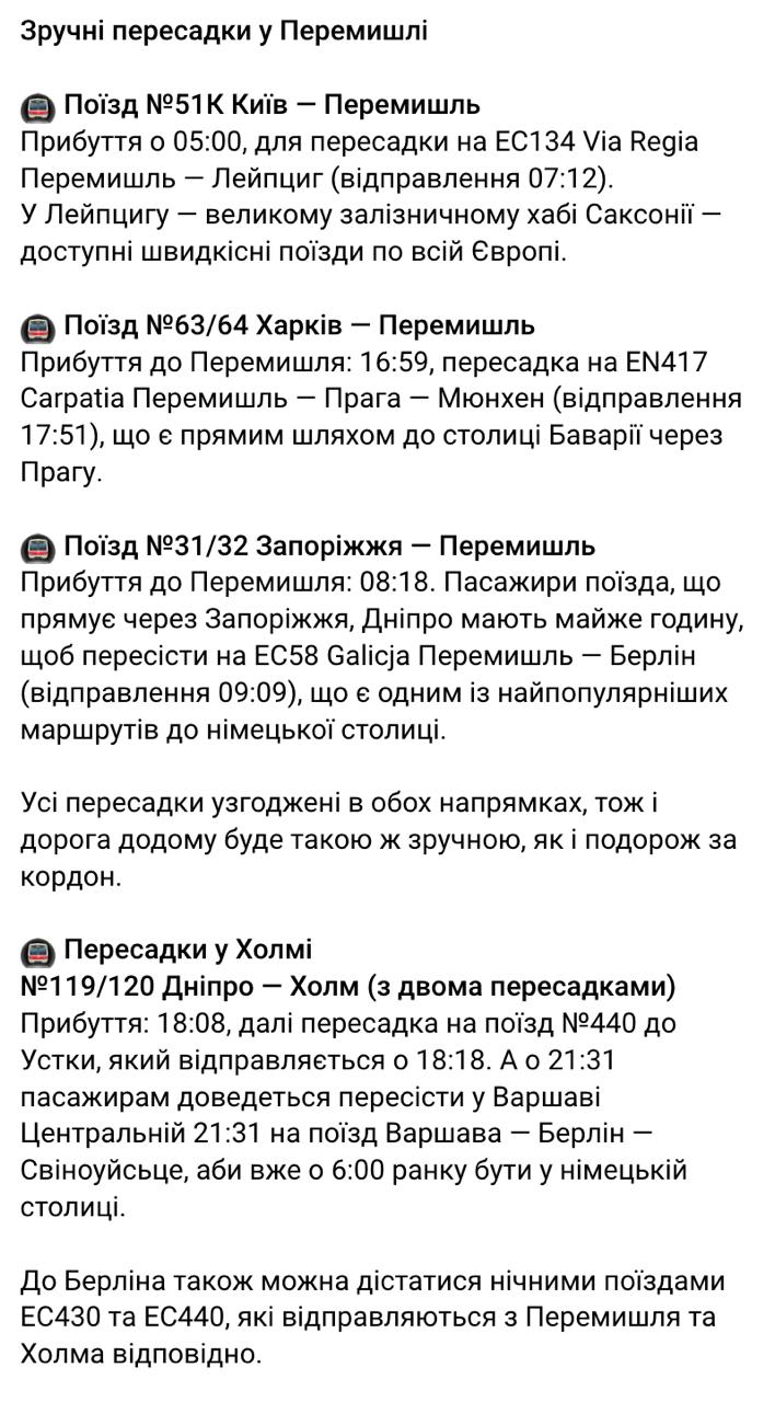 • Поезд №31/32 Запорожье — Перемышль. Прибытие в Перемышль: 08:18. Пассажиры, следующие через Запорожье и Днепр, имеют почти час, чтобы пересесть на EC58 Galicja Перемышль — Берлин (отправление в 09:09) — один из самых популярных маршрутов в столицу Германии.