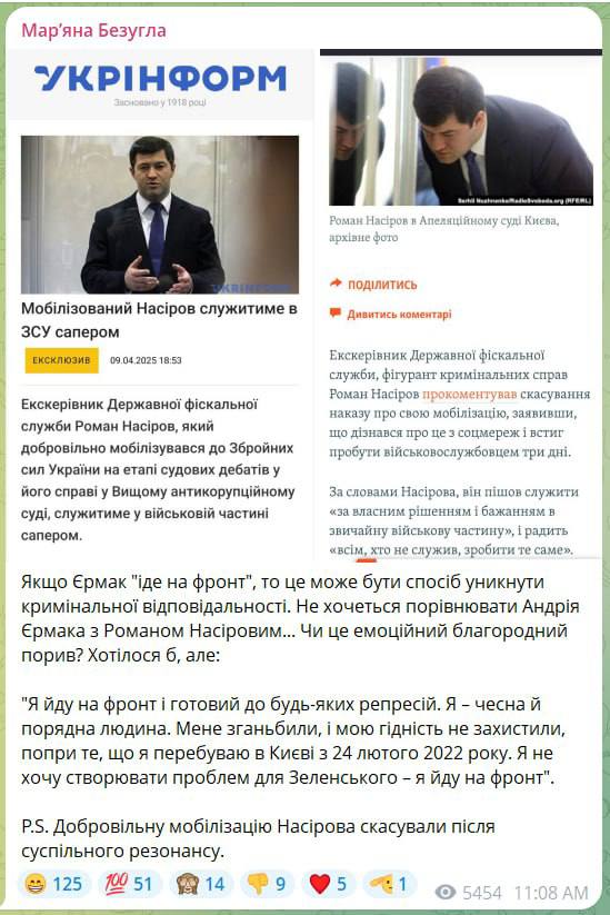 Она сравнила слова Ермака о добровольной мобилизации с аналогичным поступком экс-руководителя фискальной службы Романа Насирова, который пошел служить во время судебного разбирательства против себя.