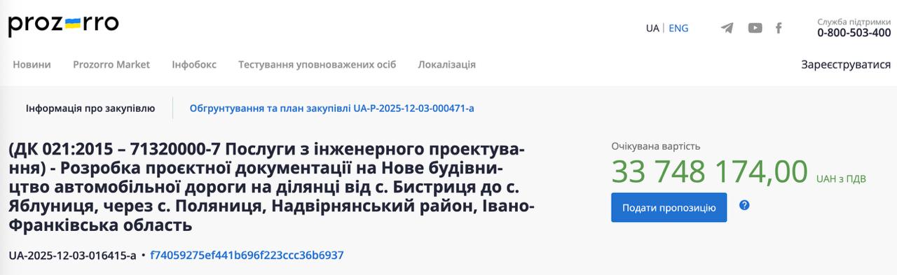 При этом отмечается, что недавно уже был заключен один контракт на 2,1 млрд грн на капитальный ремонт существующей дороги Ивано-Франковск – Надворная на 23-километровом участке до Быстрицы.