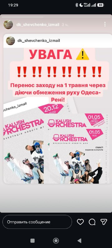 Завтрашний концерт музыкального коллектива "Калуш Оркестра" в Измаиле Одесской области перенесен на 1 мая из-за блокирования после обстрела моста трассы Одесса - Рени.