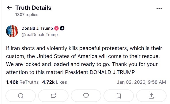 Президент США Дональд Трамп пригрозил Ирану "действиями", если власти страны будут убивать протестующих, которые уже несколько дней выходят на улицы из-за экономического кризиса.