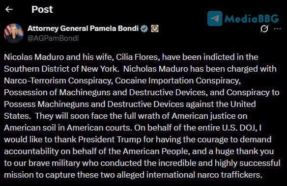 "Николас Мадуро и его жена Силия Флорес были обвинены в Южном округе Нью-Йорка. Николас Мадуро обвиняется в заговоре с целью наркотерроризма, заговоре с целью импорта кокаина, владении автоматическим оружием и разрушительными устройствами, а также заговоре с целью владения автоматическим оружием и разрушительными устройствами против Соединенных Штатов. Вскоре они столкнутся с полным гневом американского правосудия на американской земле в американских судах", - сообщила Бонди.
