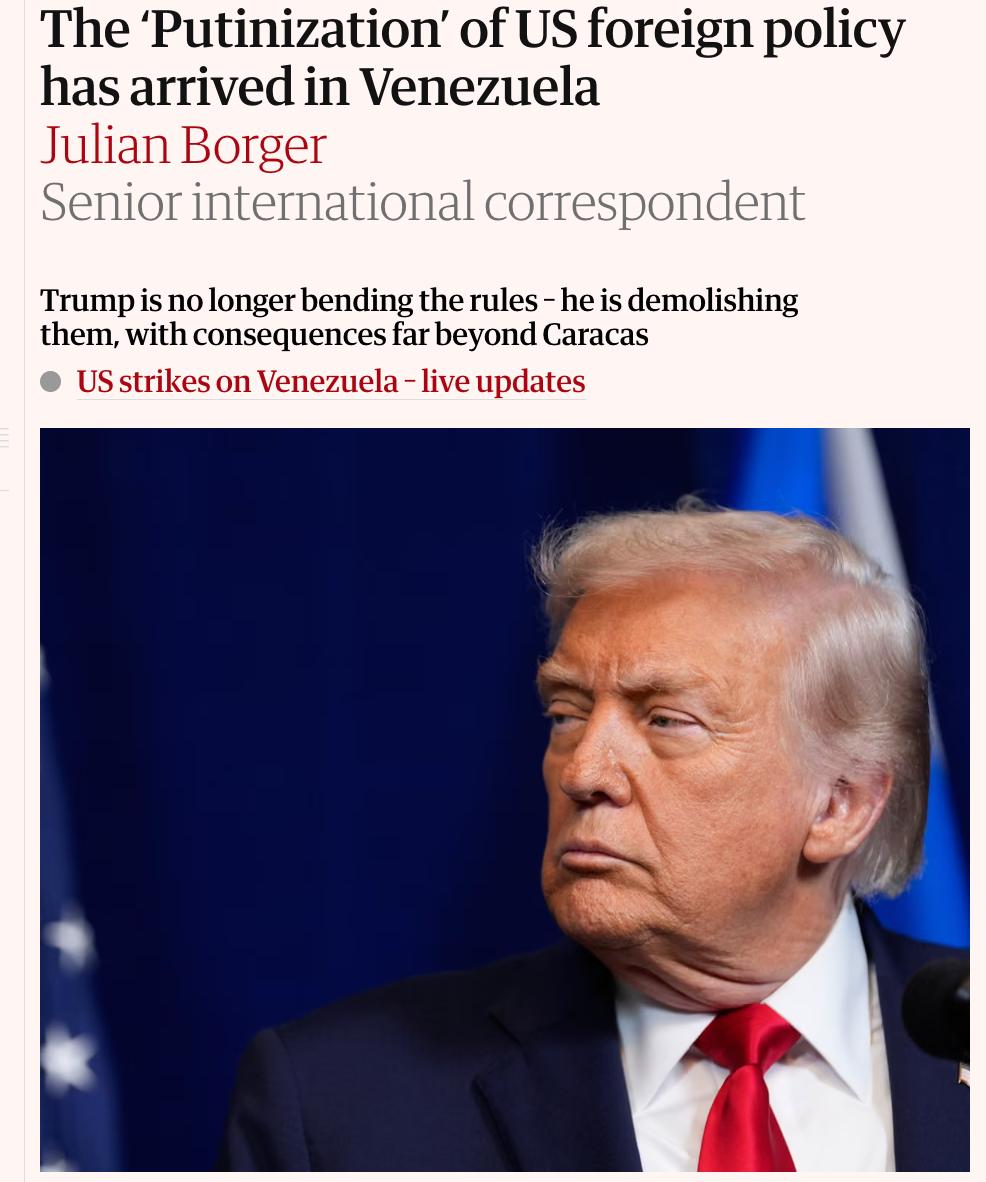 В газете отмечают, что захват президента Венесуэлы Николаса Мадуро сработал, и именно это является самым тревожным сигналом. Успех операции усилил уверенность Трампа в собственной безнаказанности и открыл путь к дальнейшим силовым действиям ради контроля над территориями и ресурсами.