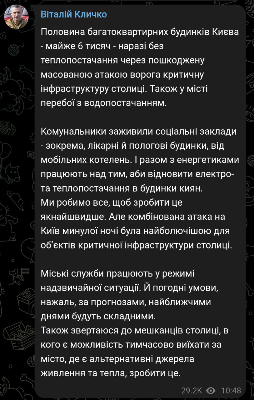 "Коммунальщики обеспечили социальные учреждения - в частности, больницы и роддома - мобильными котельными. Вместе с энергетиками они работают над восстановлением электро- и теплоснабжения в дома киевлян. Мы делаем всё, чтобы восстановить их как можно скорее. Но комбинированная атака на Киев прошлой ночью была самой болезненной для объектов критической инфраструктуры столицы", - написал Кличко.