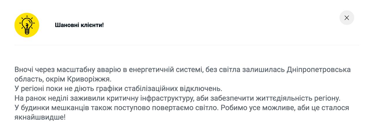 Перебои с электроснабжением также наблюдаются в Днепропетровской области. По данным ДТЭК, ночью произошла авария в энергосистеме.