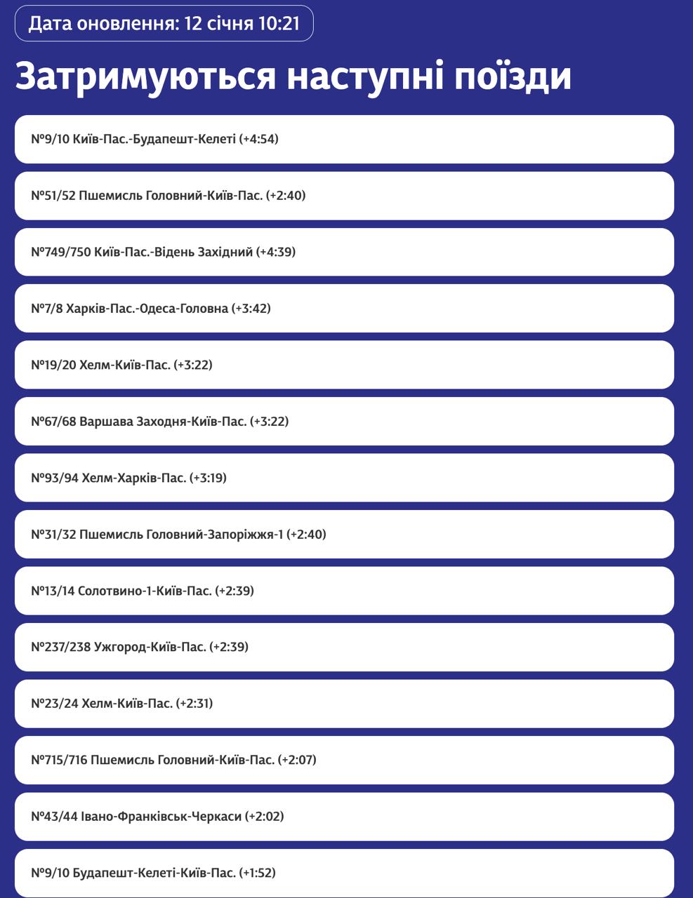 11.20 Несколько поездов задерживается из-за ночного удара РФ по железнодорожной инфраструктуре, сообщает "Укрзализныця".