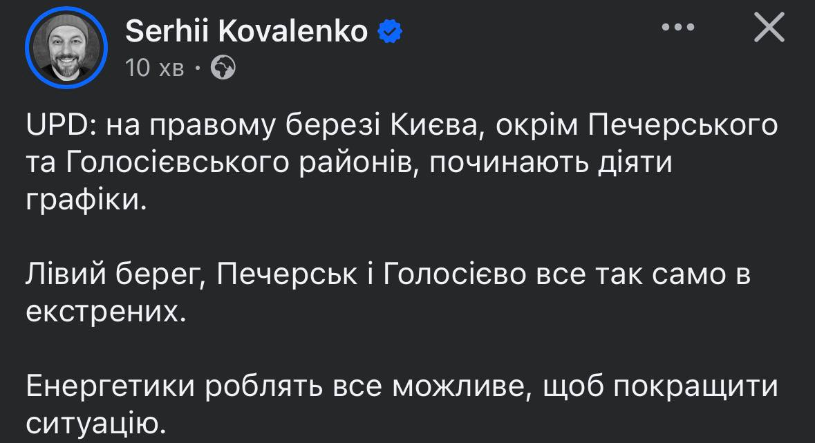 При этом компания уточняет, что на левом берегу, а также в Голосеевском и Печерском районах действуют экстренные отключения – 3-5 часов со светом и 7-12 – без.