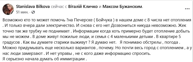 В свою очередь жительница дома на улице Бойчука (Печерский район) Станислава Билкова сообщает на своей странице в Фейсбуке, что отопления в нем нет с 8 января, электричество дали вчера, но сегодня опять отключили. В квартирах, по ее словам, +5 градусов.