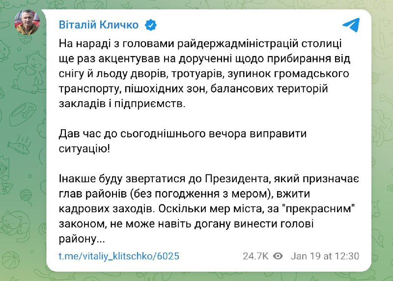 "На совещании с главами райгосадминистраций столицы еще раз акцентировал внимание на поручении об уборке от снега и льда дворов, тротуаров, остановок общественного транспорта, пешеходных зон, балансовых территорий заведений и предприятий. Пора до сегодняшнего вечера исправить ситуацию! Иначе буду обращаться к президенту, назначающему глав районов (без согласования с мэром), принять кадровые меры. Поскольку мэр города по "прекрасному" закону не может даже выговор вынести главе района..." - сказано в публикации.